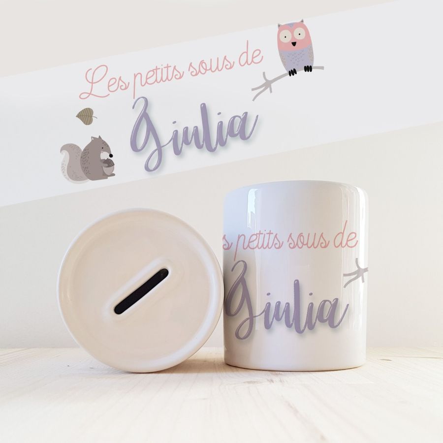 Tirelire en céramique personnalisée avec le prénom de l'enfant ou un petit texte.