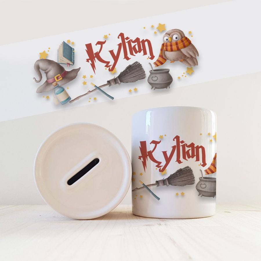 Tirelire en céramique personnalisée avec le prénom de l'enfant ou un petit texte.