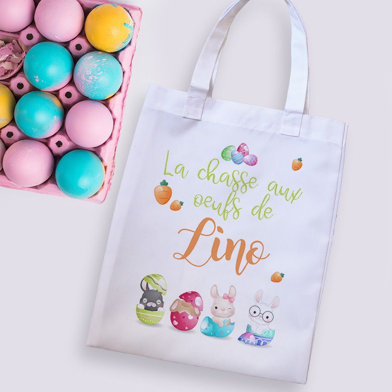Tote bag blanc personnalisé sur le recto avec le prénom de l'enfant pour partir faire la chasse aux œufs de Pâques !