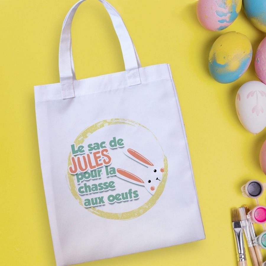 Tote bag blanc personnalisé sur le recto avec le prénom de l'enfant pour partir faire la chasse aux œufs de Pâques !