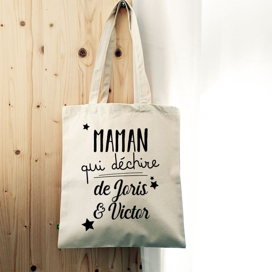 Grand totebag  personnalisé en coton avec le texte "Maman qui déchire de ... prénoms des enfants"